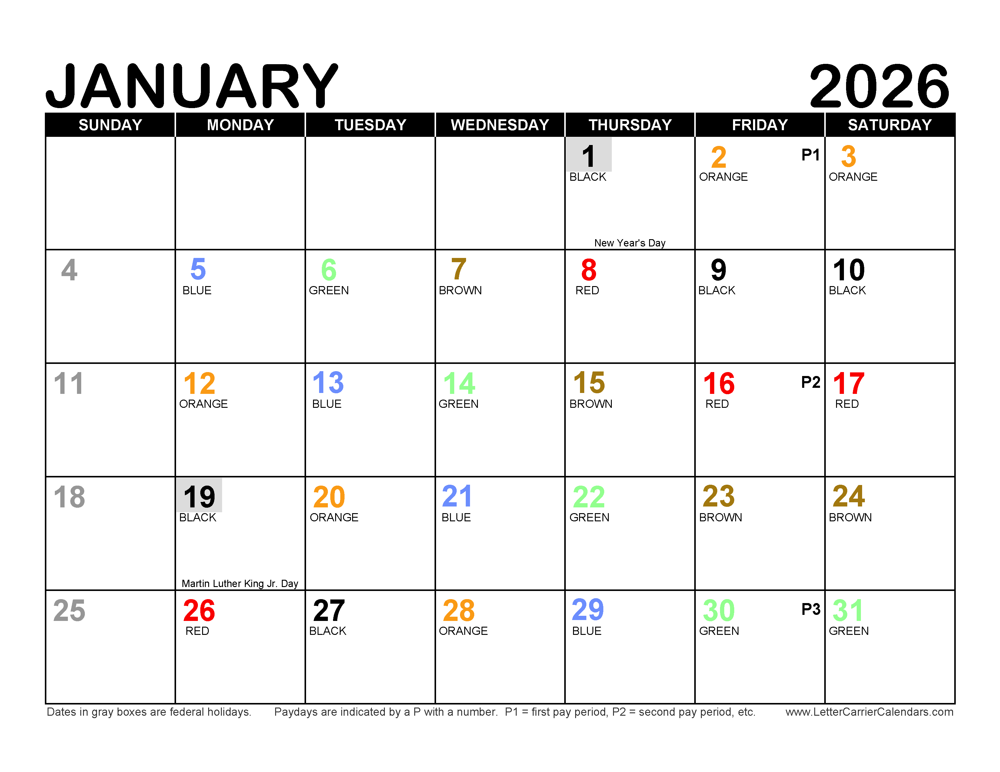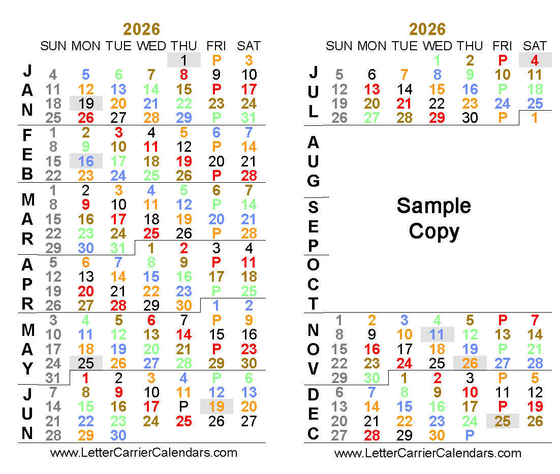 Our calendars are available in two color schemes. Purple version: order of colors is orange (yellow), green, purple, black, red, blue. Brown version: order of colors is red, black, orange (yellow), blue, green, brown. If you are ordering color-coded calendars for the first time, we recommend the purple version. The distribution of colors on the purple version seems to make the colors more distinguishable, and therefore make that calendar easier to read.